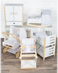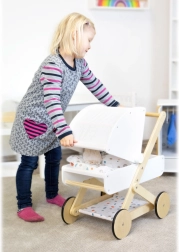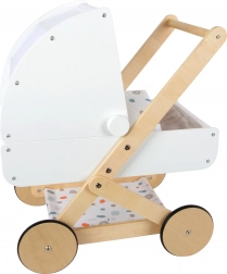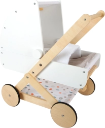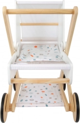 Odkrijte kakovosten voziček za punčke, ki se odlično poda v vsako otroško sobo. Združuje naravni les, trpežne in pralno-obrisljive tkanine ter nežno barvno paleto. Nizka teža in stabilna konstrukcija zagotavljata varno vožnjo, medtem ko gumirana kolesa poskrbijo za tih tek na katerikoli podlagi.
