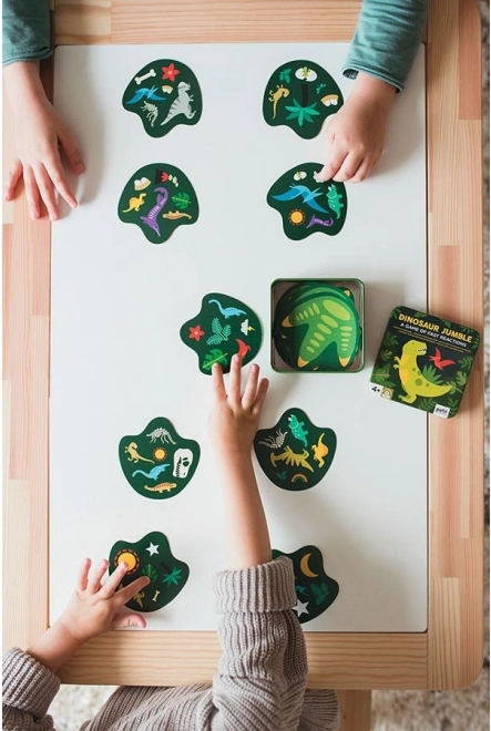 Vadite svojo pozornost z dinozavri. Ta karte igra ponuja do pet različic pravil in je polna barvitih ilustracij na temo dinozavrov. Hitro vam bo prirasla k srcu tudi zaradi priročne velikosti, zato je primerna za igro doma in na poti. Pakirano v kovinski škatlici brez uporabe plastike. Glavne značilnosti za 2–6 igralcev 5 različic pravil praktična embalaža Navodila za igro: Osnovna različica: Vsakemu igralcu razdelite eno karto z licem navzdol. Paket kart obrnjen z licem navzgor položite med igralce. Na dogovorjen znak igralci obrnejo svoje karte. Igralec, ki prvi poimenuje enak simbol na svoji karti in na karti v paketu, vzame karto iz paketa. Tako se paket na koncu pobere in zmagovalec je igralec z največ kartami. Obrnjena različica: Razdelite karte med igralce tako, da imajo vsi enako število kart, ena karta pa ostane. Igralci položijo svoje karte v kupčku pred sebe z licem navzdol. Preostalo karto, obrnjeno z licem navzgor, položite med igralce. Na dogovorjen znak igralci obrnejo vrhnjo karto svojega kupčka. Kdor prvi poimenuje simbol, ki je enak na njegovi karti in na karti med igralci, svojo karto položi med igralce na nastajajoči kupček in obrne naslednjo svojo vrhnjo karto. Tako igra poteka, dokler ne ostane zadnji igralec s kartami, ta postane poraženec. Igralec, ki se kart prvi znebi, je zmagovalec. Skupinska različica: Igra se po krogih. V vsakem krogu vsak posameznik prejme po eno karto z licem navzdol. Na dogovorjen znak igralci obrnejo svojo karto, tisti, ki poimenuje in napove simbol, enak simbolu na karti drugega igralca, mu svojo karto preda. Tako igra poteka, dokler en igralec ne prejme vseh v posameznem krogu razdeljenih kart. Cilj igre je znebiti se kart; igralec, ki je v seštevku krogov prejel največ kart, je poraženec. Dimenzije embalaže: 10 × 10,5 × 5 cm Starost: 4+ Material: kovina, papir Število delov: 31 kosov