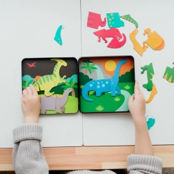 Magnetni igralni set dinozavri Petit Collage prinaša otrokom neskončno mero ustvarjalnosti in zabave. Zahvaljujoč trpežnim magnetnim delom si lahko zlahka ustvarijo svoje dinozavre in prizore, ki zaživijo na dveh tematskih ozadjih. Priročna kovinska škatlica vse drži na enem mestu in je odlična za na pot.