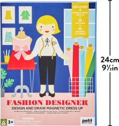 Igrača vsebuje magnetno figurico z lesenim stojalom, 36 magnetnih kosov oblačil, 4 obojestranske voščenke in 35 nalepk, kar omogoča ustvarjanje več kot 100 različnih stilov. Otroci lahko izražajo svojo kreativnost in razvijajo domišljijo z raznolikostjo kosov in možnostmi kombinacij. Škatla služi ne le kot shranjevalni prostor, temveč tudi kot prijetno ozadje za igro, s čimer postane celotna izkušnja celovita in estetska.