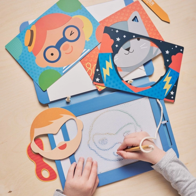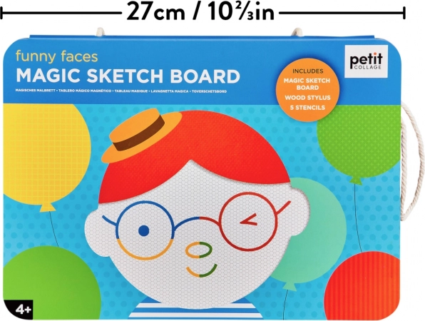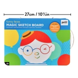 Ta risalna tabla ima kompaktne mere 27×19×1 cm in vsebuje enostavno pisalo, pritrjeno na tablo z vrvico. Zahvaljujoč brisalcu in šablonam lahko otroci svoje ideje zlahka spremenijo v nove stvaritve!