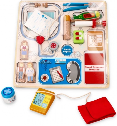 Ta barvita vstavljanka znamke Bino otrokom na igriv način predstavlja svet zdravstva. Zaradi jasno oblikovanih koščkov otroci zlahka prepoznajo in uvrstijo stetoskop, termometer, injekcijo in druge pripomočke na pravo mesto na plošči. Med igro vadijo prijem, zbranost in potrpežljivost.