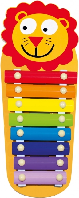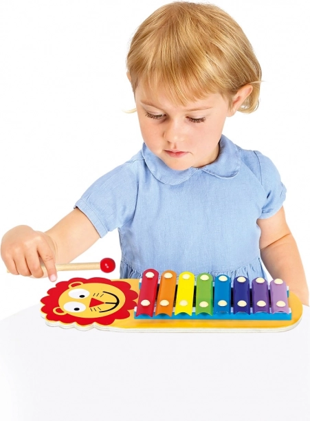 Otroški ksilofon z veselim motivom levčka prinaša zabavno učenje in kreativno igranje. Osem barvitih kovinskih ploščic na lesenem okvirju zveni jasno in prijetno, zato otroci zlahka odkrivajo tone, ritem in prve melodije. Del paketa sta dve leseni paličici za udobno igranje z obema rokama.