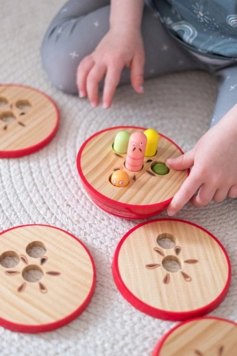 Vsaka raven ima različno število odprtin – otroci sestavljajo tako, da se ujema s številom kukajočih črvičkov. Zabavna pot do logičnega razmišljanja in zbranosti.