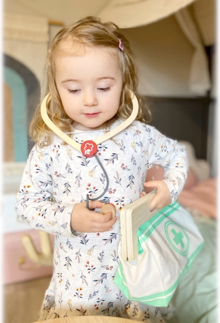 Od stetoskopa prek termometra z nastavljivo temperaturo pa do merilnika krvnega tlaka z manšeto in balončkom – otroci imajo pri roki vse, kar potrebujejo za majhen pregled.