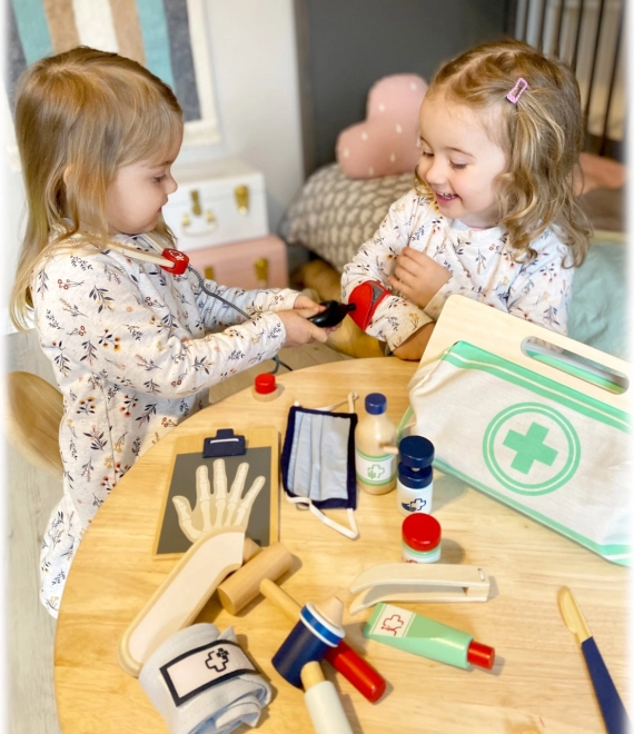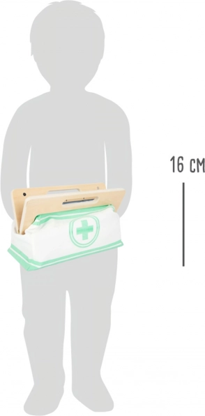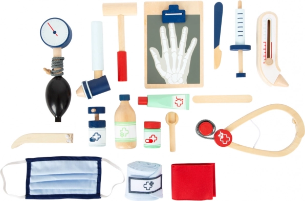 V kompletu je bogata oprema: stetoskop, termometer z nastavljivo temperaturo, injekcijska brizga s premičnim mehanizmom, otoskop s pravo lučko, pa tudi merilnik krvnega tlaka z manšeto in balončkom, razkužilo s pumpico, stekleničke, žlička, pinceta, skalpel, refleksno kladivce in tekstilne maske. Otroci lahko poskrbijo za »pacienta«, se naučijo osnov nege in premagajo strah pred obiskom zdravnika.