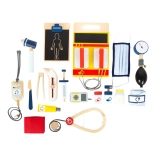 Ta reševalni nahrbtnik je idealen za otroško igro zdravnika. V notranjosti boste našli lesena orodja, kot so stetoskop, termometer, otoskop z lupo in celo defibrilator. Otroci se lahko naučijo prepoznavati medicinsko opremo in simulirati reševalne postopke.