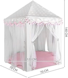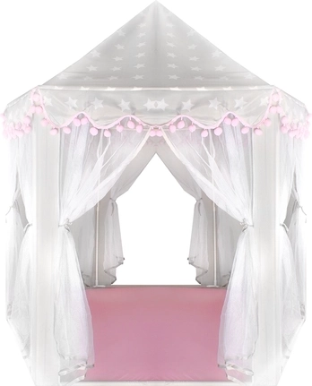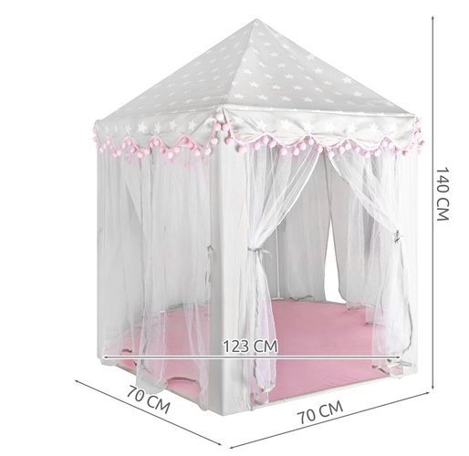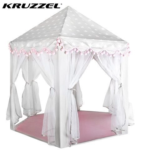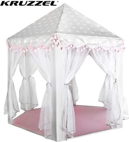 Prostorna podloga in zračne stranice zagotavljajo udobje za enega ali več otrok – vanj gre veliko blazin, plišastih igrač in knjig. Šotor je odlična izbira za notranje prostore in vrt pod nadzorom odraslih. Dekorativni cofki in možnost zavezovanja zavesic v pentlje dodajo igri šarm in zasebnost.