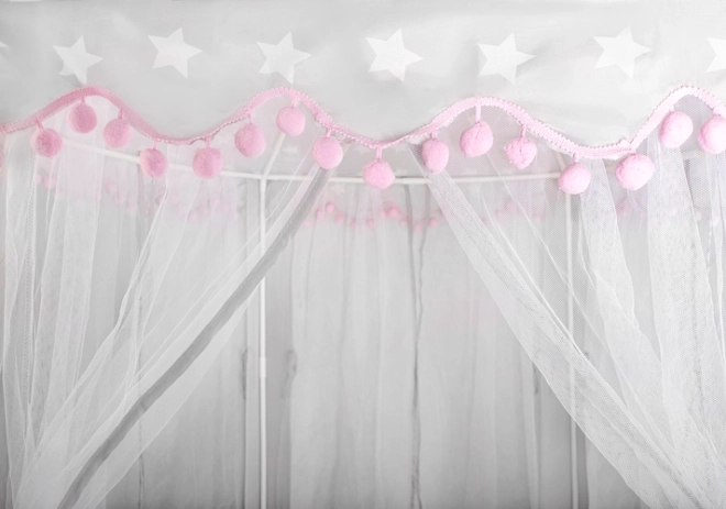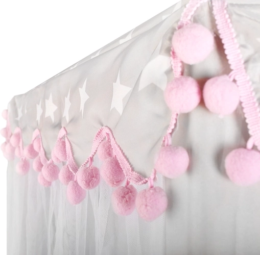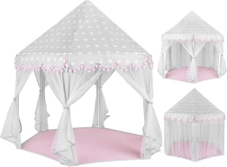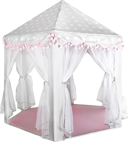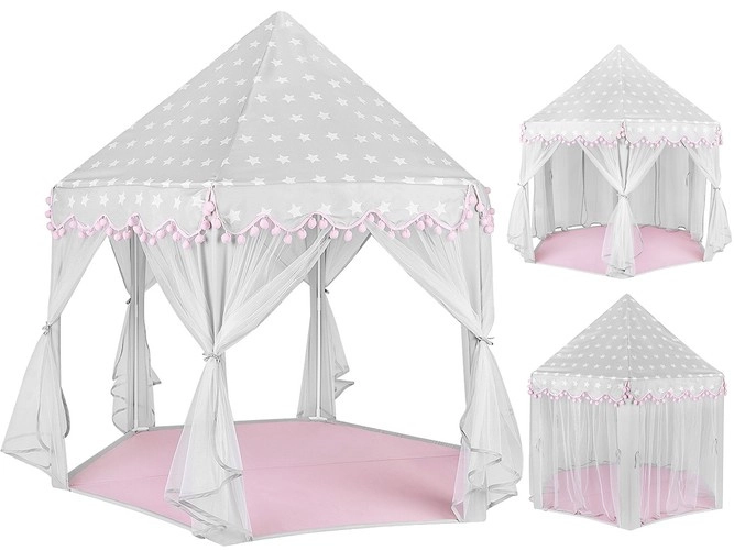 Ustvarite otrokom varen kotiček za počitek in domišljijske igre. Šotor ima stožčasto streho, 6 odprtih vhodov s svetlimi, zračnimi zavesicami in elegantno sivo‑rožnato zasnovo z zvezdicami, ki se lepo poda v otroško sobo ali igralni kotiček. Zahvaljujoč lahki konstrukciji na klik ga sestavite v hipu ter enako preprosto prenesete ali pospravite.