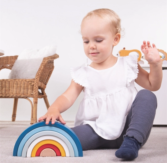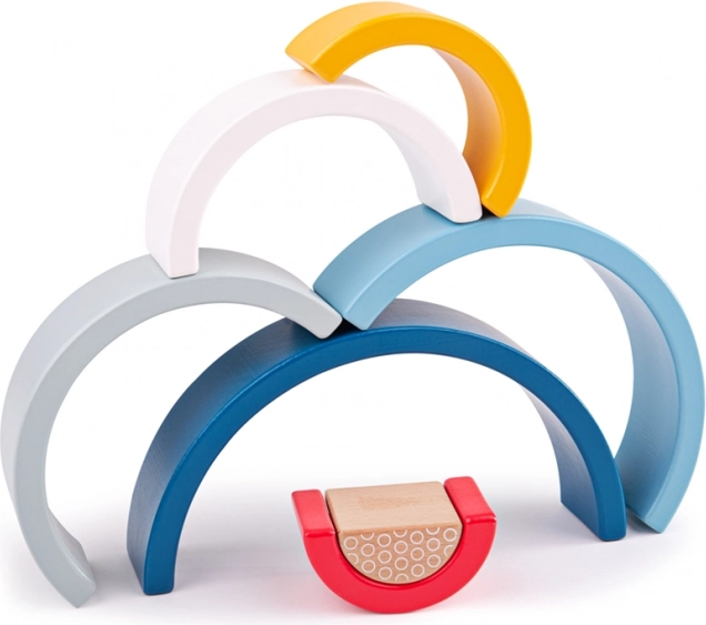 Lesena sestavljanka mavrica v živahnih barvah ponuja otrokom neskončne možnosti gradnje – od mostov in tunelov do domišljijskih konstrukcij. Vsak lok natančno pade v drugega, kar podpira koordinacijo roka–oko in uči otroke razlikovati velikosti in oblike.