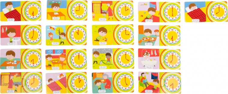 Koliko je ura? S prikupnimi slikami vsakdanjih dejavnosti se bodo otroci na igriv način naučili časa s pomočjo te igre. Vedno je treba sestaviti dva dela. Igro lahko uporabite tudi kot spomin (pexeso). Ne uči le časa, temveč spodbuja tudi fino motoriko in komunikacijo. Odlična izobraževalna igra, ki je res zabavna za vsakogar. Glavne lastnosti: uči prepoznavanja časa, lahko se uporablja tudi kot spomin, vadi motorične spretnosti