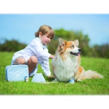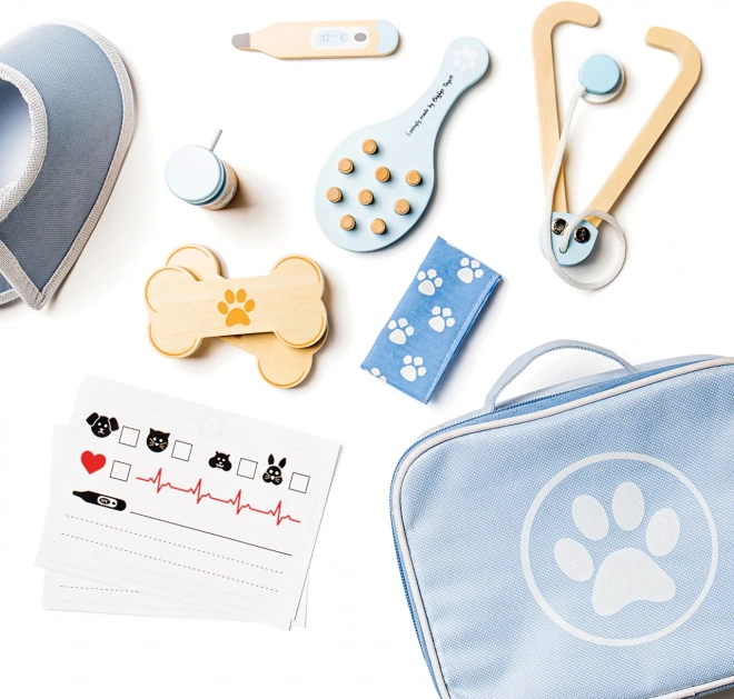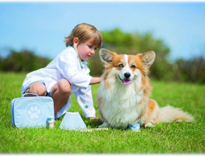 Popoln veterinarski kovček otrokom omogoča skrb za plišaste igrače in figurice ljubljenčkov kot pravi zdravnik. V kompletu ne manjkajo orodja, kot so stetoskop, termometer, otoskop, injekcijska brizga, povoj, krtača, zaščitni ovratnik in drugi dodatki. Vse je shranjeno v trpežni tekstilni torbici s tačko, idealni za prenašanje in shranjevanje.
