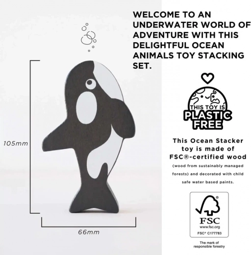 Ta kakovostna lesena sestavljanka z motivom oceana prinaša otrokom od 18 mesecev dalje ure varne in ustvarjalne igre. Kosi v obliki kita, delfina, morske zvezde, pingvina, morske želve, meduze in drugih morskih prijateljev so zasnovani tako, da jih otroci zlahka držijo, ter spodbujajo koordinacijo oko–roka, potrpežljivost in domišljijo.