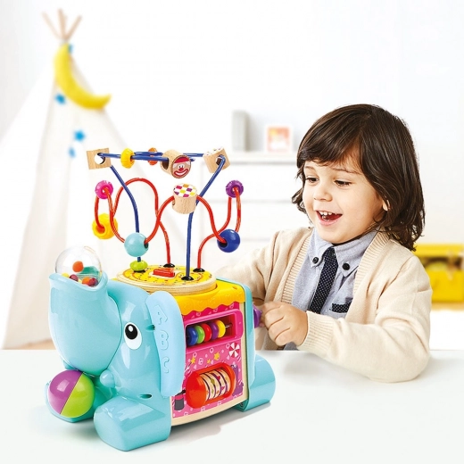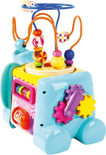 Ta večfunkcijska motorična kocka v obliki slona je idealna izobraževalna igrača za najmlajše. Zaradi barvitih elementov in raznolikih aktivnosti otroci naravno urijo fino motoriko, prostorsko zaznavo in senzorične veščine. Zgornji del sestavlja motorični labirint s kroglicami, stranice krasijo zobata kolesca, drsni deli in druge domiselne naloge.