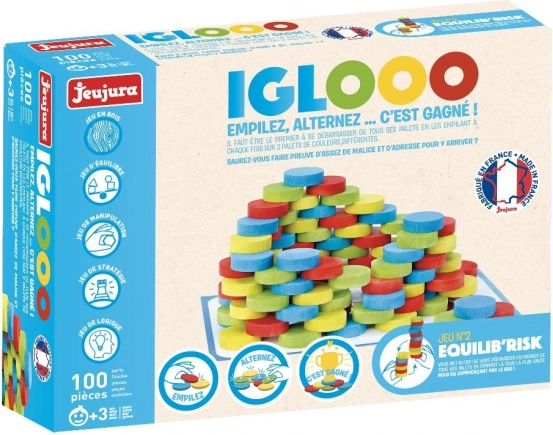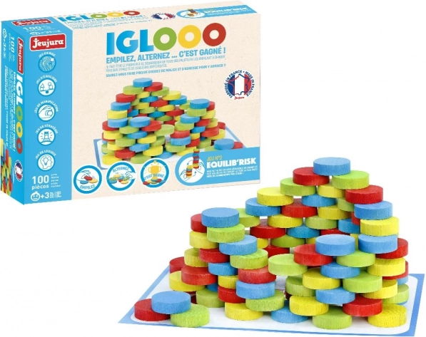 Z leseno gradbeno igračo Jeujura Iglu se lahko mali graditelji lotijo ustvarjanja trdne in slogovne konstrukcije. Ta igra spodbuja sposobnost osredotočanja in fine motorične spretnosti, idealna za otroke od treh let dalje. Igrača je skrbno izdelana iz bukovega in borovega lesa francoskega izvora. Vsak kos je prebarvan z varnimi barvami na vodni osnovi, kar zagotavlja skladnost z okoljskimi standardi.