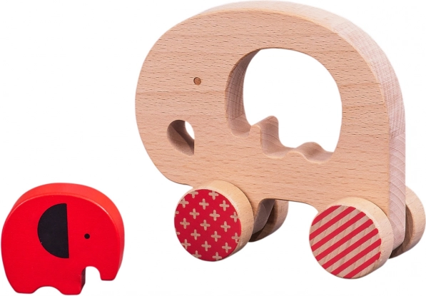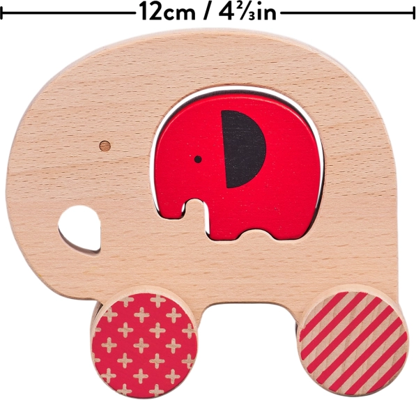 Odstranljiv rdeč mladiček se vstavi v odprtino na sredini slona. Otroci urijo prijem, logiko in koordinacijo pri vlečenju na kolescih.