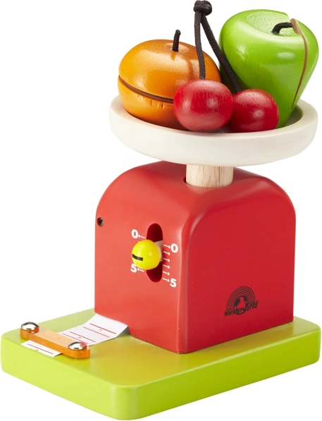 Trdna konstrukcija iz masivnega lesa in kakovosten lak v živahnih barvah zagotavljata dolgo življenjsko dobo in varno uporabo. Igrača podpira razvoj fine motorike, logičnega mišljenja in domišljije med igro trgovinice, kuhinje ali tržnice.