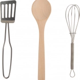 Vsebuje lonec s pokrovom, ponev, metlico, lopatko in leseno kuhalnico, ki pomagajo pri igri kuhanja.