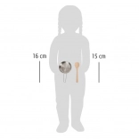 Lonec z odstranljivim pokrovom podpira realistične igralne scenarije in razvija otroško domišljijo. Lesena kuhalnica skupaj s kovinskimi orodji, kot sta lopatka in metlica, ponuja širok nabor možnosti za igro. Tekstilna prijemalka in podstavek za lonec dodajata avtentičen pridih in prispevata k varnosti pri igri.