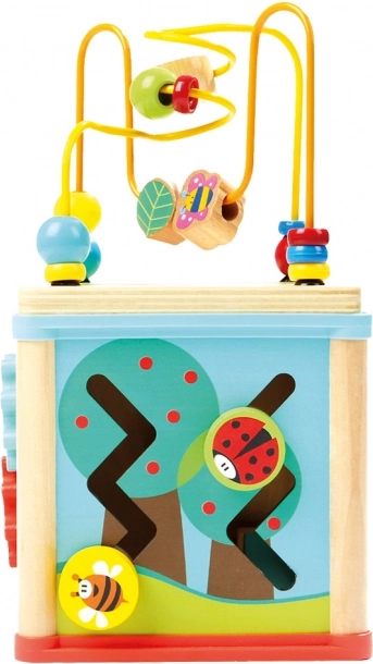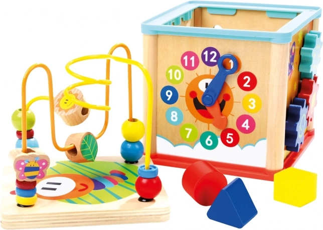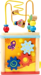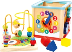 Ta barvita lesena motorična kocka ponuja otrokom od 12 mesecev dalje veliko načinov za igro in hkratno učenje. Z urami z kazalci se otroci na igriv način spoznajo s časom, koralni labirint razvija prijem in koordinacijo, druge stranice kocke pa urijo logiko, oblike in barve.