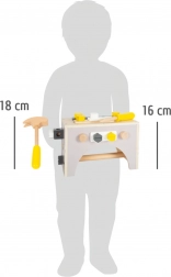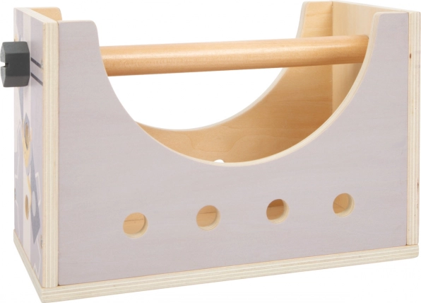 Del kompleta je 5 kosov lesenega orodja – kladivo, ključ, izvijač, nastavljivi ključ in primež – ter dovolj dodatkov za ustvarjalne projekte. Odstranljiv ročaj in praktične odprtine omogočajo hitro pospravljanje orodja, zato je škatla idealna tudi za na pot.