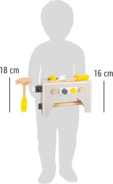 Odkrijte pametno igračo 2v1: po obrnitvi se škatla spremeni v delovno ploščo, na kateri lahko mali mojstri vijakajo, zategujejo in gradijo. Naravni les v kombinaciji z rumenimi in sivimi poudarki prinaša brezčasen videz in dolgo življenjsko dobo.