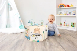 Vsaka stran ponuja drugačno nalogo: kroglični labirint, vstavljanje oblik, predevanje in razvrščanje barv, vrtljive ploščice, sestavljanko in zvonček. Otroci naravno urijo fino motoriko, koordinacijo oko–roka ter zaznavanje barv in zvokov.
