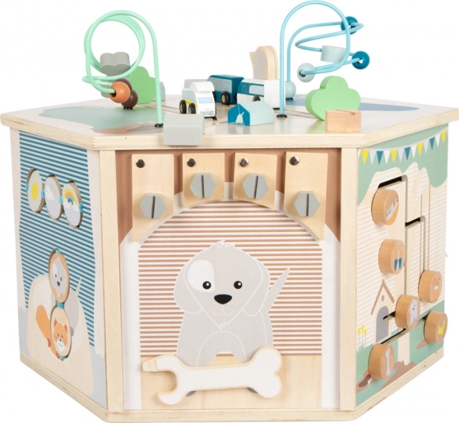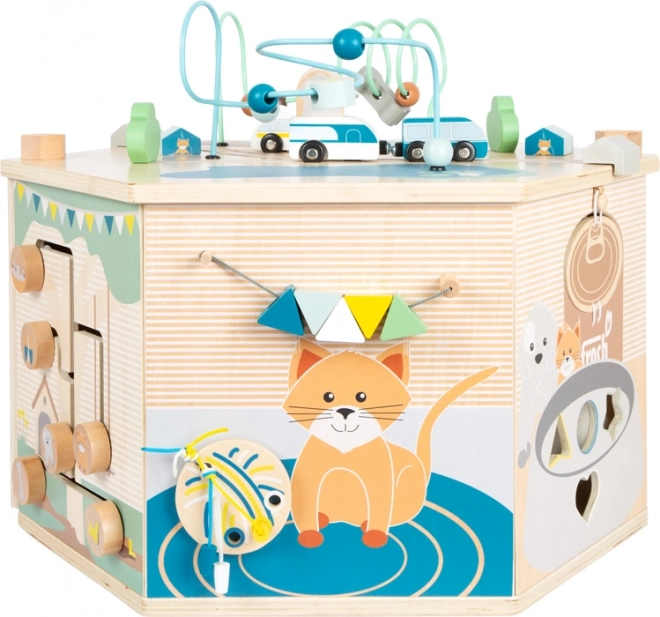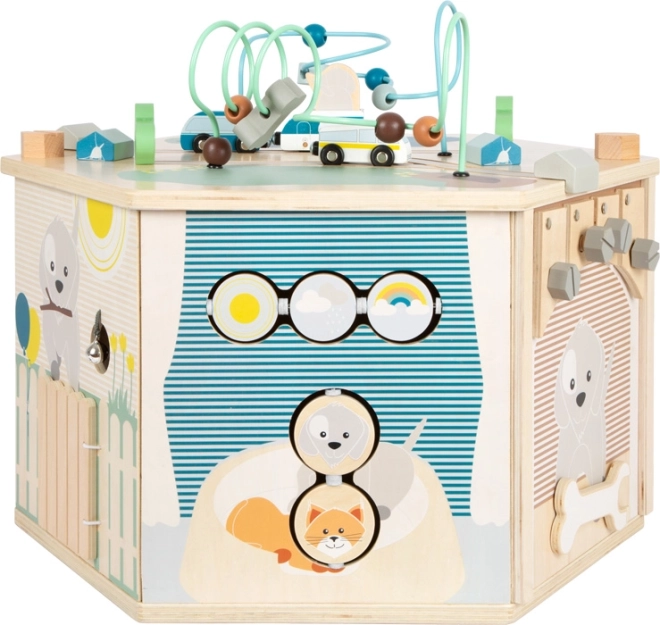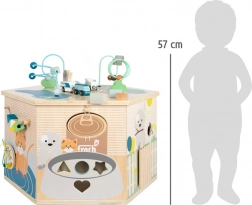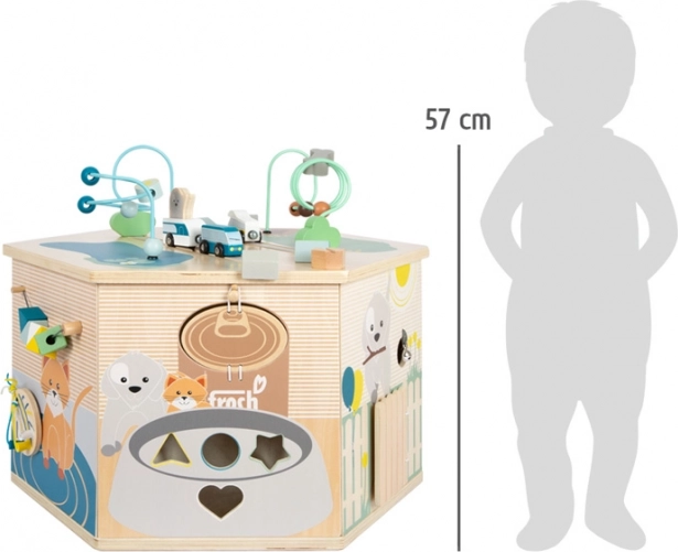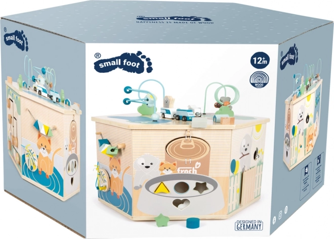 Motorična interaktivna kocka SMALL FOOT Pets XXL je premišljeno izobraževalno središče za najmlajše. Osem igralnih panelov razvija fino motoriko, tip in slušno zaznavo, z detajlnimi ilustracijami pa otrokom približa vsakdanje življenje živali. Otroci bodo odkrili kroglični labirint, vstavljanko, vrtljive ploščice, predevanko/razvrščanje barv, sestavljanko in druge interaktivne elemente, ki spodbujajo koncentracijo in logično razmišljanje.