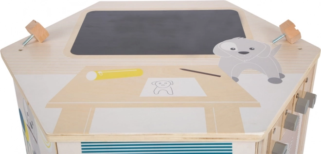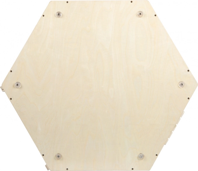 Trden les, nežne barve in gumirane nogice, ki varčujejo tla. Radodarne mere 57 × 50 × 43 cm in višina igralne površine 32 cm zagotavljajo udobno igro in odlično stabilnost.