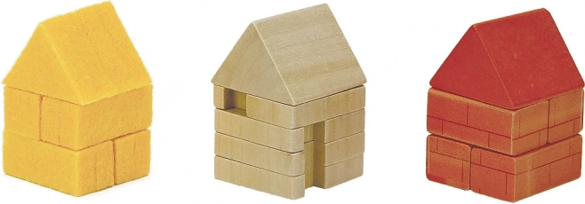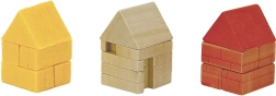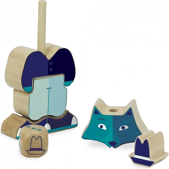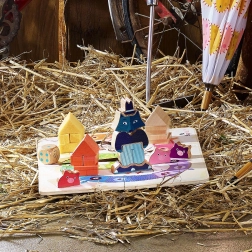 Robustni leseni deli in pisane oblike vabijo k gradnji hišk ter sestavljanju volka. Otroci naravno razvijajo finomotoriko in domišljijo.
