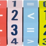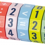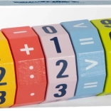Šest vrtljivih obročkov s številkami in simboli omogoča ustvarjanje primerov za seštevanje, odštevanje, množenje in deljenje do 99 – zabavna pot do razumevanja osnov.