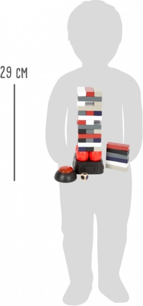 Igro je mogoče igrati tudi kot klasični majavi stolp brez podstavka in časomera, kar jo naredi univerzalno izbiro za otroke in odrasle. Barvite lesene kocke razvijajo fino motoriko, zbranost in potrpežljivost, medtem ko zvočni brenčač doda dramatičnost. Kakovostna izvedba iz lesa in plastike zagotavlja dolgo življenjsko dobo in varno igro.