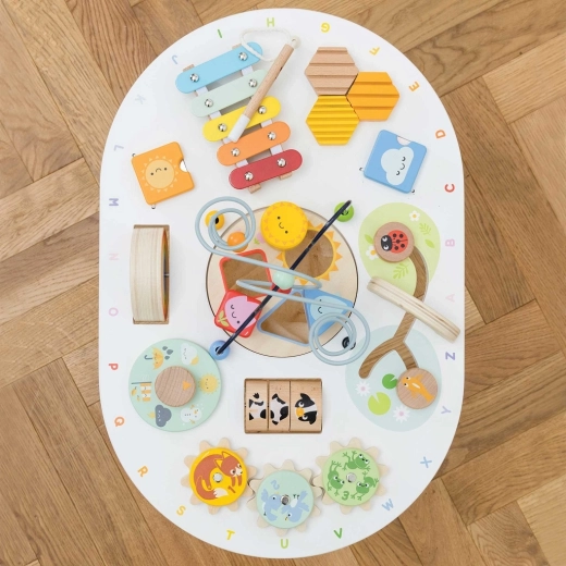 Ta robustna motorična mizica je polna veččutnih dejavnosti, ki otroke zaposlijo za dolge ure. Zaradi kombinacije glasbenih, gibalnih in logičnih elementov razvija koordinacijo oko–roka, prepoznavanje oblik in barv ter tudi prvo glasbeno dojemanje.