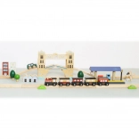 Ta velika lesena železniška proga popelje otroke v srce mesta, navdihnjenega z Londonom. Z bogato opremo – od postaje in pisanih stavb do ikoničnega dvižnega mostu – ponuja nešteto igralnih scenarijev ter spodbuja odprto, domišljijsko igro. Dva vlaka z magnetnimi vagoni se zlahka spajata in varno vozita po stabilnih lesenih tirih.