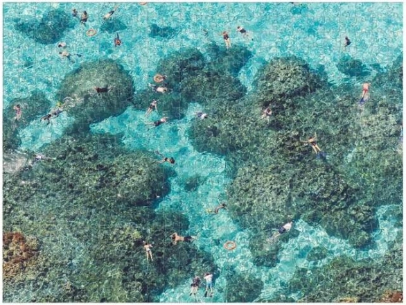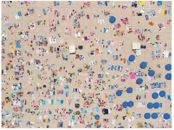 Stilska dvostranska sestavljanka, navdihnjena z ikoničnimi aeroposnetki Gray Malin, prinaša privlačen izziv in hkrati dekorativen rezultat. Ena stran prikazuje živahno plažo iz ptičje perspektive, druga mirno gladino oceana s skalami in plavalci. Zahvaljujoč različni površinski obdelavi (sijaj/mat) zlahka prepoznate, katero stran trenutno sestavljate.
