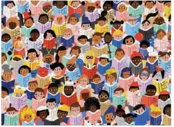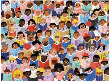 Uživajte ure zabave z umetniško sestavljanko, ki prinaša živahen prizor ljudi, zatopljenih v knjige. Zaradi kakovostne izdelave iz recikliranega papirja in uporabe netoksičnih črnil je ta komplet odlična izbira za družine in ljubitelje dizajna. Končana sestavljanka z merami 68,6 × 50,8 cm bo lepo izstopala tudi v okvirju.