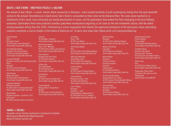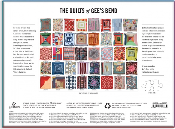 Potopite se v vizualno osupljivo zbirko patchwork vzorcev, navdihnjenih z ustvarjalnostjo žensk iz Gee’s Benda v Alabami. Ta 1000-delna sestavljanka ponuja kombinacijo bogatih barv in geometrijskih motivov, ki ustvarjajo edinstveno podobo z visoko dekorativno vrednostjo.