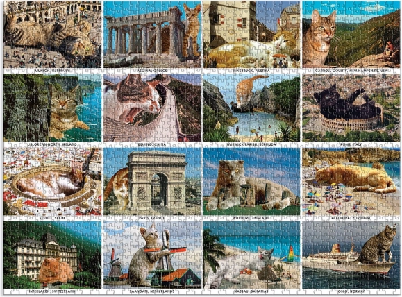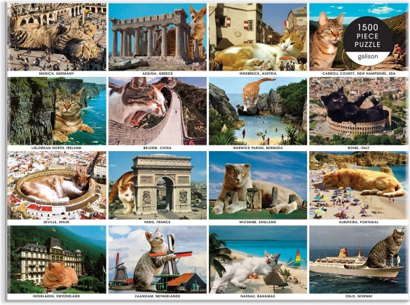 Šaljiva sestavljanka z mačkami na počitnicah s 1500 kosi ponuja zabavo in sprostitev. Vsebuje šestnajst realističnih fotografij, na katerih uživate v mačkah, ki občudujejo znane kraje sveta.