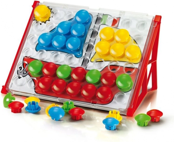 Odkrijte ustvarjalni mozaik QUERCETTI za najmlajše! Komplet vsebuje 48 velikih, nelomljivih gumbov s premerom 32 mm, prozorno ploščo z luknjami ter 8 dvostranskih kart z 16 predlogami. Praktično stojalo za poševno postavitev olajša igro doma in na poti. Igra razvija vizuomotorično koordinacijo, fino motoriko in ustvarjalnost otrok od 2. leta dalje.