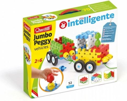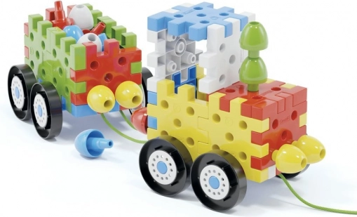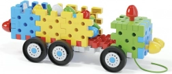 Sestavljajte iz ploščic in zatičev avtomobilčke, hiške in drevesa! Ta inovativni gradbeni set vsebuje med seboj povezljive ploske 3D dele in velike zatiče različnih barv, s katerimi lahko tudi majhni otroci sestavljajo različne avtomobilčke, hiše, stolpe, drevesa in še veliko drugih stvari. Med skupno 62 elementi kompleta je tudi 8 koles za podvozja avtomobilčkov in 3 vrvice, s katerimi lahko avtomobilčke vlečete. Poleg različnih avtomobilčkov omogoča komplet ustvarjanje tudi raznolikih ploščatih in tridimenzionalnih struktur, s čimer pri otrocih od 2 do 6 let vadi in razvija fino motoriko, koordinacijo oko–roka in prostorsko orientacijo ter hkrati podpira njihov kognitivni razvoj. Vsebina pakiranja: 20 med seboj povezljivih ploskih 3D delov, 16 med seboj povezljivih zatičev, 8 koles, 3 vrvice za vleko avtomobilčkov. Glavne lastnosti: razvija fino motoriko, ustvarjalnost, domišljijo in logično-kombinatorično mišljenje; pakiranje vsebuje 52 delov; za otroke od 2 let dalje. Dimenzije pakiranja: 40×34×9 cm. Starost: 2+. Material: plastika. Vsebuje 62 delov.