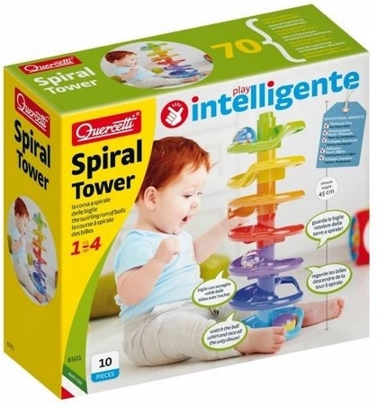 Quercetti Spiralni stolp je odlična igrača za razvoj motorike in zabavo. Otroci od 1 do 4 let lahko sestavijo visoki spiralni stolp iz barvnih delov in opazujejo, kako krogle z ropotajočimi kroglicami kotalijo navzdol. Ta igrača pritegne njihovo pozornost in podpira koordinacijo rok in oči.