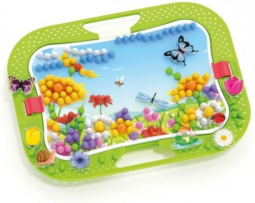 Ustvarite si iz žebljičkov svojo cvetočo vrtno kuliso! Klasični žebljički Quercetti v barvni različici, ki predstavlja svet narave. Set vsebuje žebljičke različnih barv in premerov, z vstavljanjem katerih oblikujete različne krajinske prizore, ter veliko nalepk in figuric metuljev, kačjih pastirjev, pikapolonic in drugih bitij, s katerimi lahko naselite svoj naravni svet. Vsebina pakiranja: 1 preluknjana podloga 28 × 20 cm, 2 vzorčni sliki, 300 žebljičkov v 6 različnih barvah, 16 figuric, 1 podstavek z stojalom, 1 leseno prebodno pero. Glavne lastnosti: razvija fino motoriko, ustvarjalnost in domišljijo, vsebuje 316 gumbkov, za otroke od 3 let dalje.