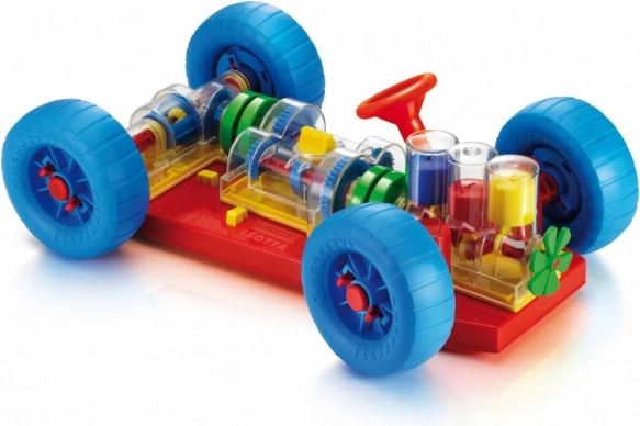Dovršena igrača, ki neposredno spodbuja otroke in njihove starše k odkrivanju, kako deluje pravo avtomobilsko vozilo. Vse osnovne mehanske funkcije so tu natančno reproducirane. Pri motorju bodo otroci videli, kako delujejo valji in ročična gred ter kako so povezani s menjalnikom, ki ima funkcionalno prestavljanje s 3 položaji (nevtralno, 1. in 2. prestava). Diferencial prenaša gibanje na zadnja kolesa in omogoča, da se vrtijo neodvisno drug od drugega. Vse mehanske dele je mogoče preprosto pritrditi na podvozje in jih enako enostavno sprostiti s posebnimi vzmetenimi rumenimi gumbi. Volan je funkcionalen in omogoča avtomobilu zavijanje ali vožnjo na parkirišče. Otroci lahko avto spredaj in zadaj dvignejo s posebnimi vozički, z vrtenjem ročice na sprednjem vozičku pa spravijo v pogon celoten mehanizem. Pri prestavljanju posameznih prestav bodo videli, kako se spreminja hitrost vrtenja koles in valjev. Ob vklopu nevtralnega položaja bodo opazili tudi, kako se motor in diferencial medsebojno odklopita. Primerno za otroke od 3 let. Glavne lastnosti: reproducirane osnovne mehanske funkcije, funkcionalen volan in mehanski deli, za otroke od 3 let