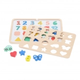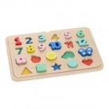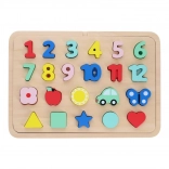 Vstavljanka vsebuje barvite koščke s številkami od 1 do 12 in različne oblike, ki otroke učijo prepoznavanja.