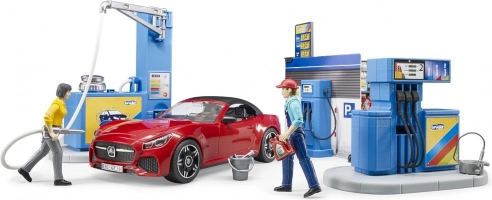 Bruder bencinska črpalka s športnim avtom in 2 figuricama