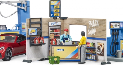 Del seta je tudi prilagodljiv športni avto z odstranljivimi kolesi in streho, ki je v celoti združljiv s figuricami in dodatki BRUDER BWORLD. Obojestransko potiskane kulise, police s kanistri in cenik spodbujajo ustvarjalno in poučno igro.