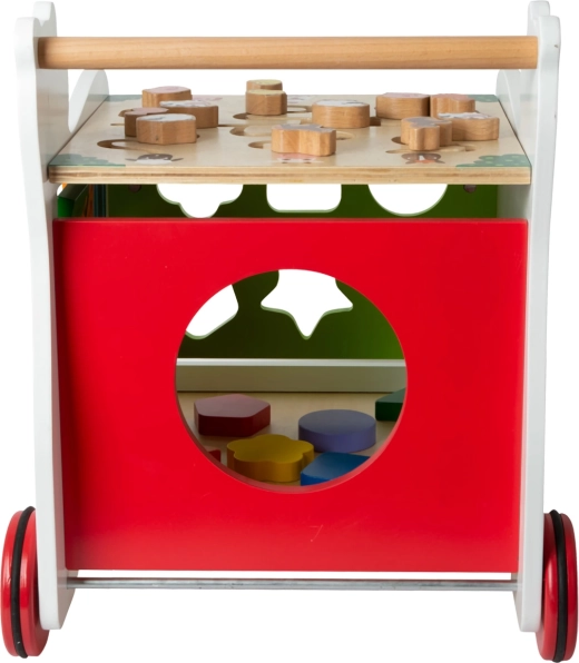 Zaradi gumiranih koles je premikanje tiho in prijazno do vseh vrst tal. Hojica ponuja tudi shranjevalni prostor za kocke in drobnarije, zato je igralni kotiček vedno hitro pospravljen.