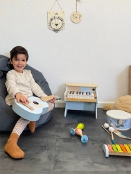 Priložena sta notni zapis in dve trzalici za majhne in velike roke, da lahko otroci začnejo igrati takoj. Kitara spodbuja naravni razvoj akustičnega zaznavanja, koordinacije prstov in ritmičnega čuta.
