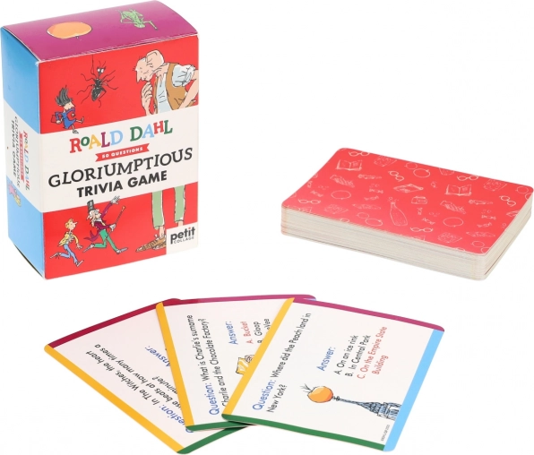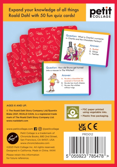 Postanite mojster zgodb Roalda Dahla s kviz kartami, ki preizkušajo vaš spomin in znanje. Vsebujejo 50 kart z vprašanji, ki vam in vaši družini nudijo odlično zabavo doma ali na poti. Zaradi ilustracij gospoda Quentina Blakea so karte hkrati prijetne na oko. Izdelane iz 100% FSC certificiranega papirja in natisnjene z rastlinskimi črnili, izpolnjujejo stroge ekološke standarde.