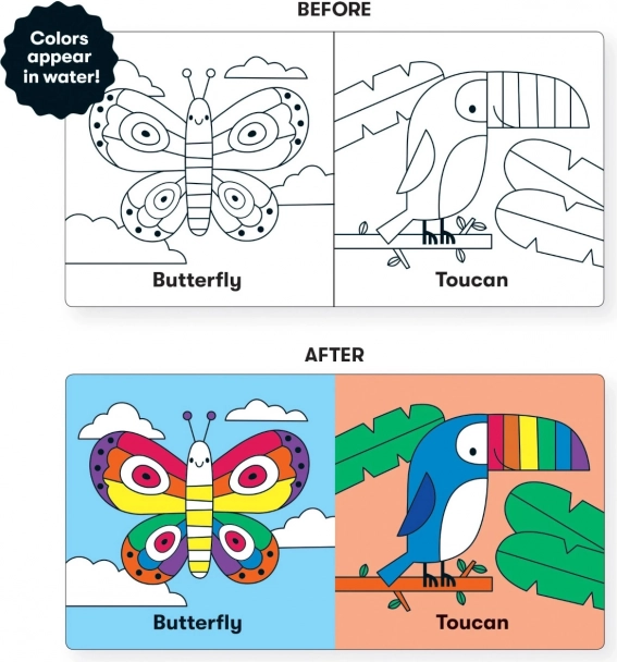 Odkrijte edinstveno knjižico za vodo, ki kopanje spremeni v priljubljen ritual. Dovolj je, da jo potopite, in ilustracije se v hipu obarbajo v živahne odtenke. Mere 15 × 15 × 3 cm in mehak material so idealni za drobne otroške roke.